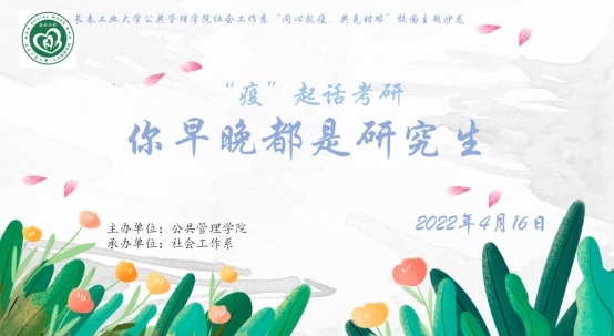 2022年4月16日19:40,beat365中文官方网站开展第一场主题为《“疫”起话考研——你早晚都是研究生》的大学生校园主题沙龙。本场活动邀请到东师马克思主义哲学专业的张皓学长、吉大英语专业的李超学姐、中南财大社会工作专业的王凯强学长作为特约嘉宾,beat365中文官方网站社会工作专业刘迪同学作为访谈嘉宾,一起和同学们探讨考研问题。