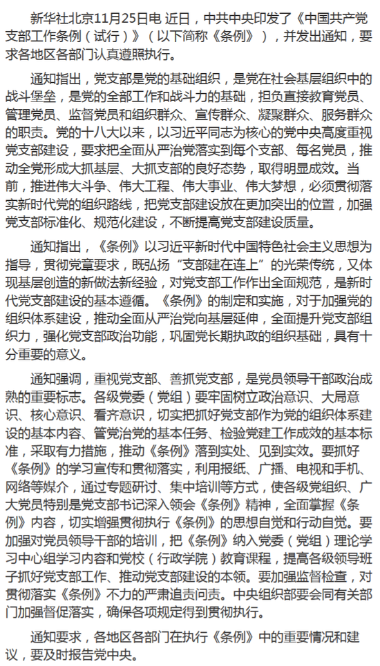 中国共产党支部工作条例(试行)全文