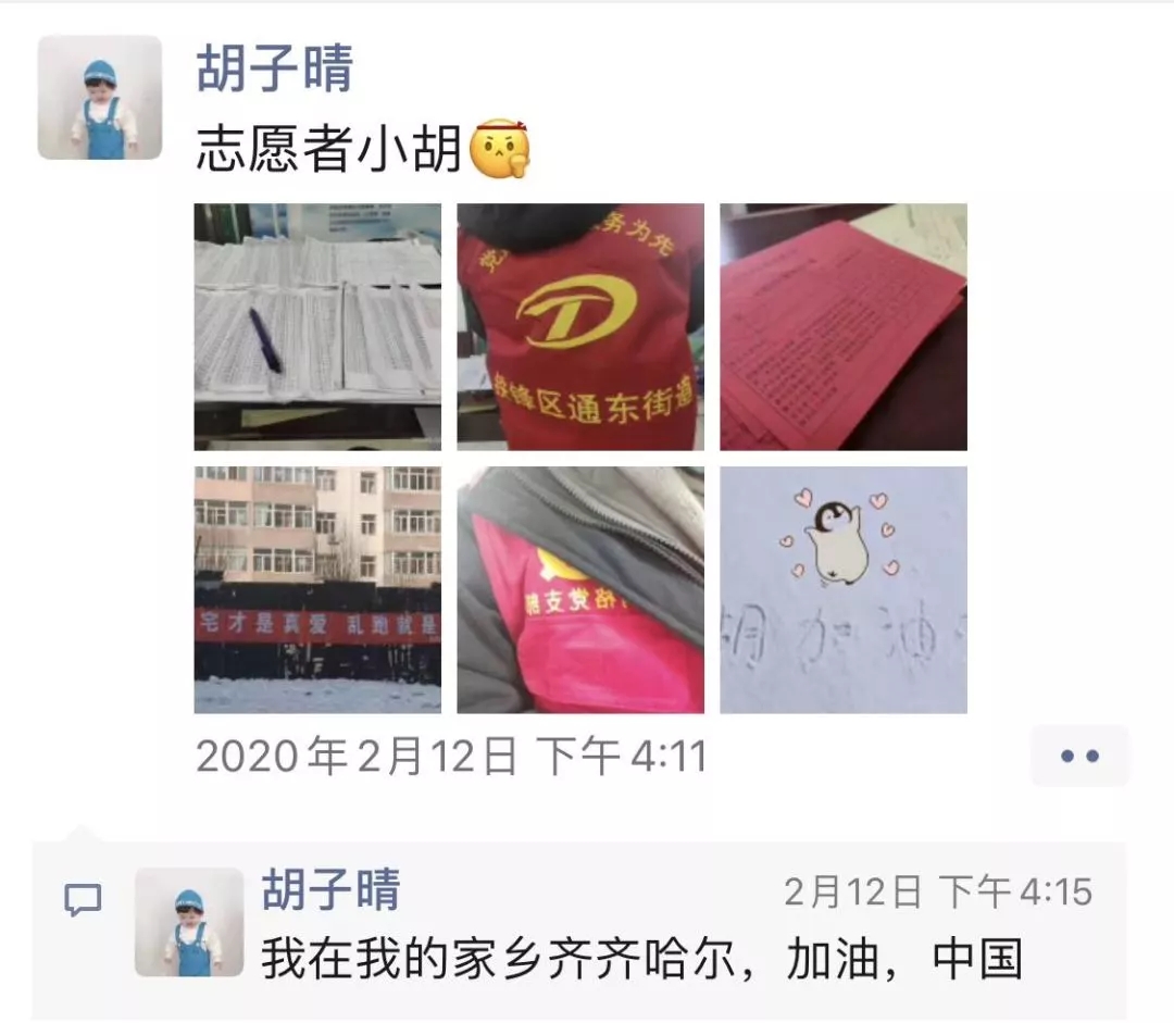 在祖国的边陲黑龙江省齐齐哈尔市,有最美逆行者,他们已经开始第四次援鄂行动,也有一直工作在医疗一线的医务工作者,还有在寒风里恶劣的天气中坚守岗位的警察同志,更有社区工作人员坚守在基层一线,守卫社区居民健康安全。而她也在里面尽自己微弱的一份力量,她叫胡子晴,是beat365中文官方网站公共事业管理专业2019级的学生。她的父母,一个作为医务工作者,一个作为党员一直工作在一线。她深受父母的感召,在回到家自我隔离15天后,第一时间报了名,当了一名志愿者。