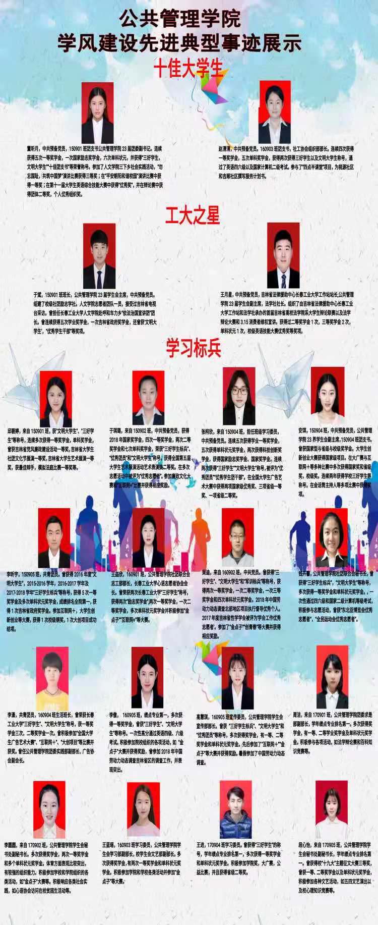 院团委书记王越老师召开了由团学联主要学生干部参加的“beat365中文官方网站学风建设质量提升月”的会议,布置了开展“学风建设月”活动的主要任务。各班召开了关于学风建设的主题班会,各班学委针对大家在学习过程中遇到的问题反思总结,并制定了下一阶段班级学风建设计划,强调了课堂纪律的重要性,同时倡导同学们自主学习。为了宣传我院“学风建设月”的活动,学院制作了以“学风建设先进典型事迹展示”为主题的板报,向全校同学展示了我院董昕月、赵清清等20位先进典型的事迹。