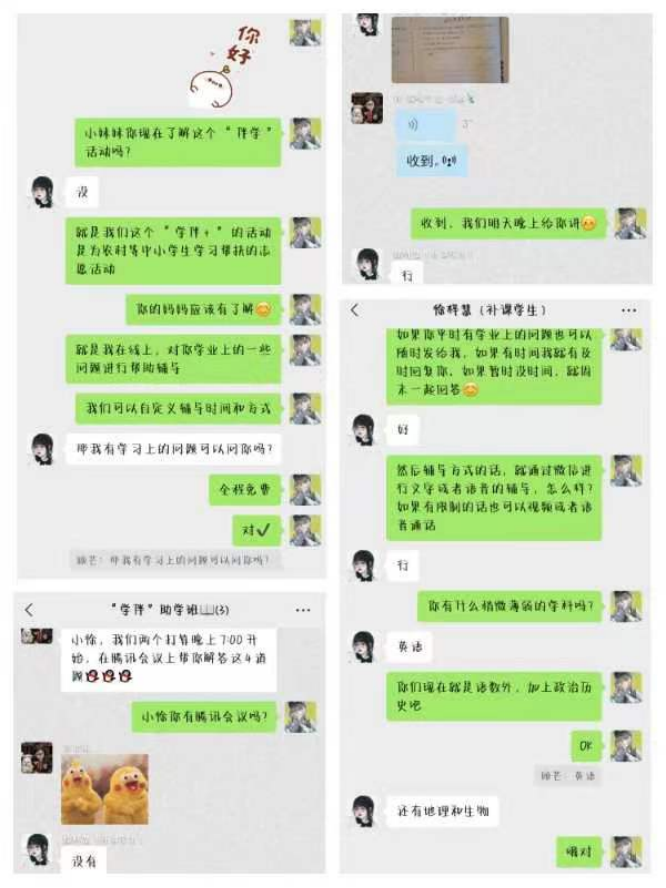 活动开展以来,我院一批政治觉悟高、业务素质好的优秀青年积极主动报名参加,并在第一时间完成结对子。“学伴+”志愿者们根据服务对象年级、学科、主要学业帮助诉求等,组建“一对一”、“多对一”的学业帮帮团,通过微信、QQ等即时通讯软件,及时解答服务对象学业问题,用热情与真诚践行志愿精神,得到了学生家长和学生们的一致认可和好评。接下来让我们一起看看beat365中文官方网站“学伴+”志愿者们的伴学故事与心声。
