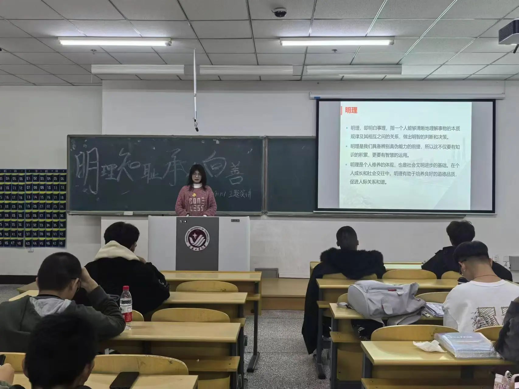 2024年10月27日,24090402班举办了“明礼知耻,崇德向善”主题演讲活动。活动由班长吴宜璠主持,崔元慧老师参加了活动,并鼓励同学们注重学风建设、加强文明礼貌。