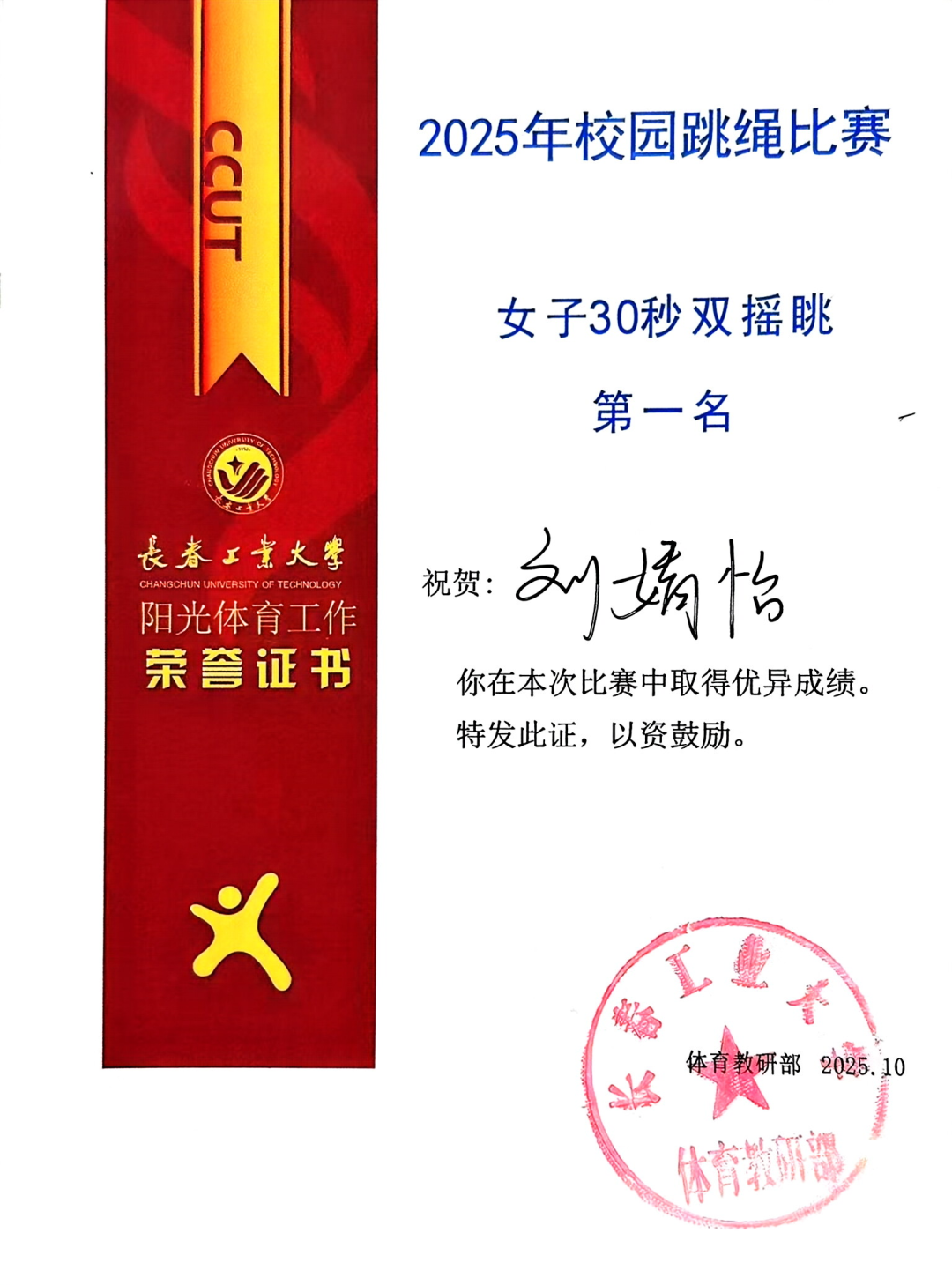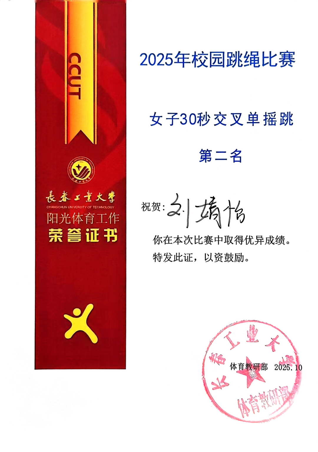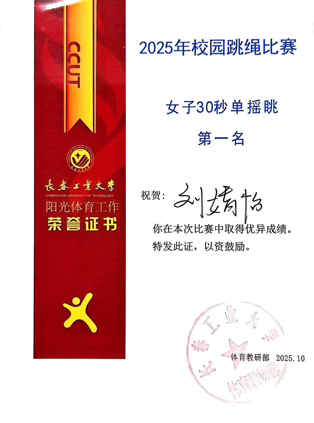 10月15日,在我校举行的2025校园跳绳比赛中,beat365中文官方网站代表队以昂扬的斗志和出色的表现闪耀全场,最终荣获团体总分第二名的好成绩!其中,刘婧怡同学表现尤为亮眼,包揽女子30秒单摇跳、双摇跳第一名及女子30秒交叉单摇跳第二名。