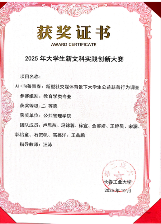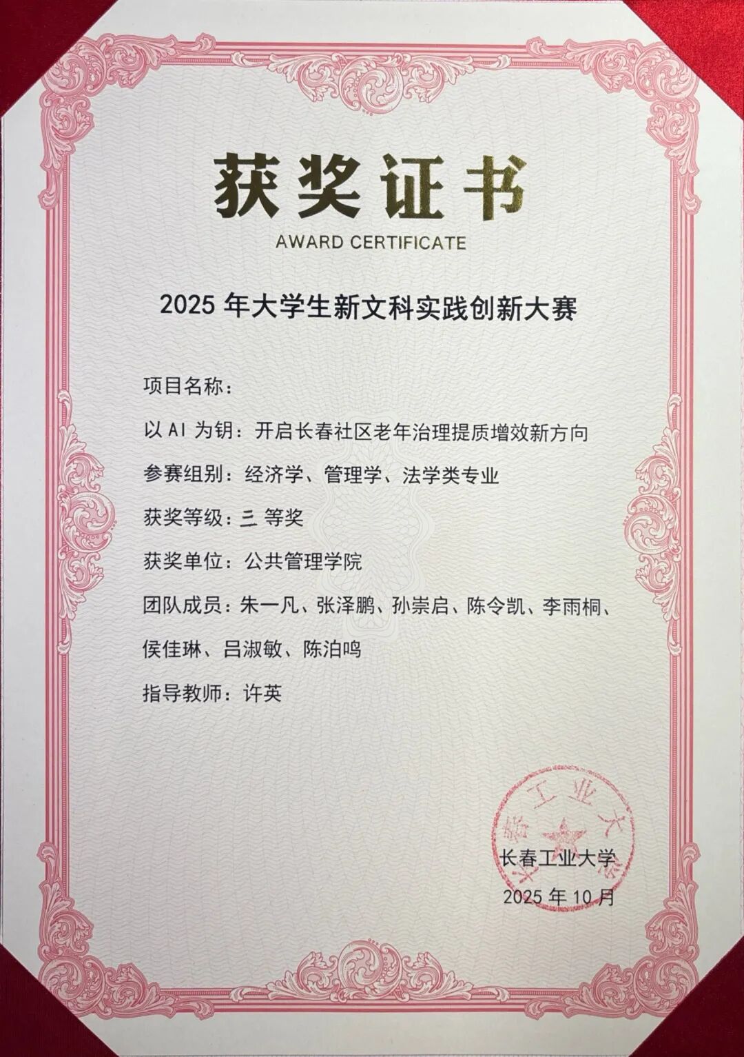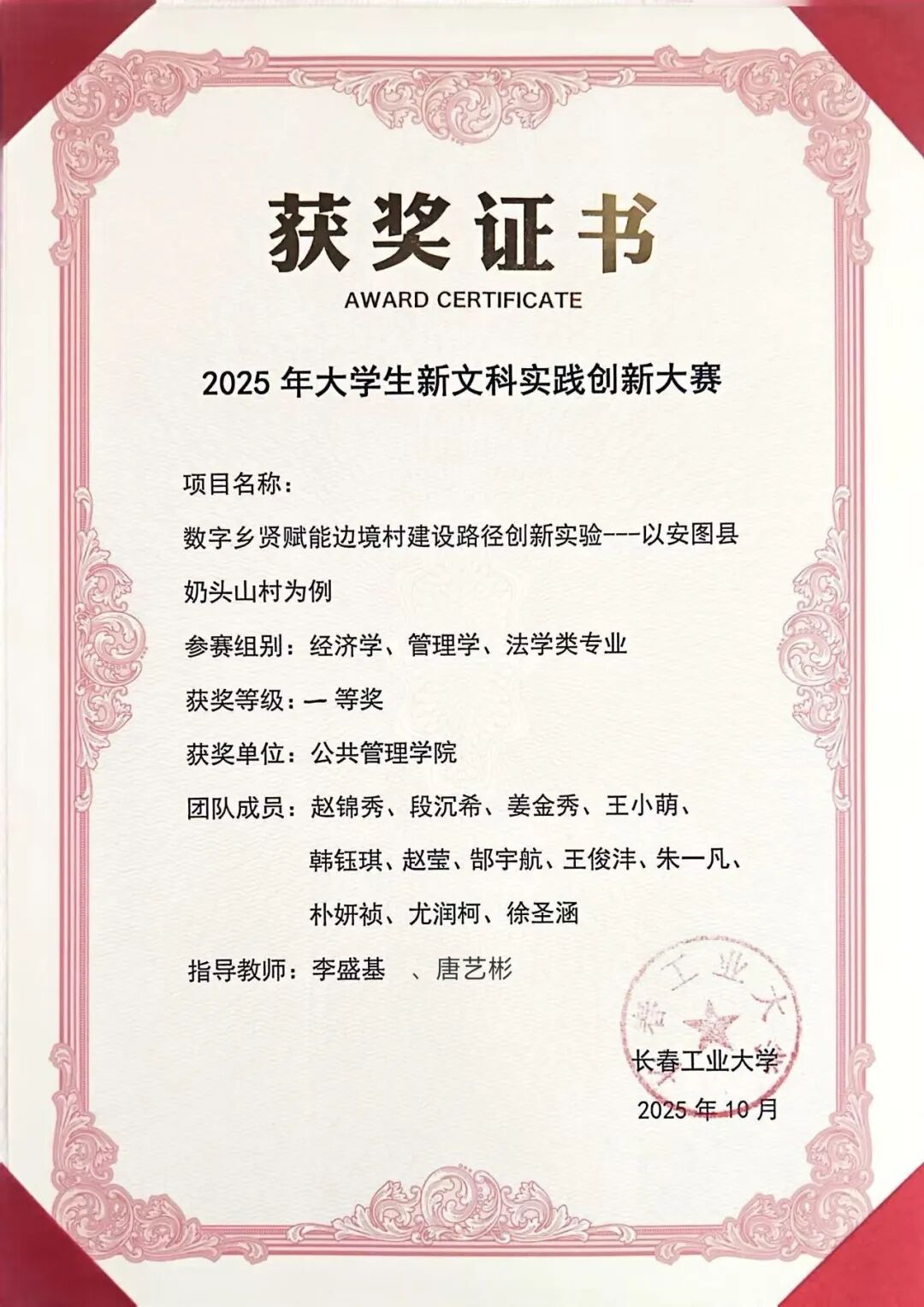 新闻网讯(通讯员 朱珠)热烈祝贺我院学子在2025年大学生新文科实践创新大赛中凭借扎实的专业素养与创新实践能力,斩获佳绩,充分展现了公管学子在新文科领域的实践创新风采!