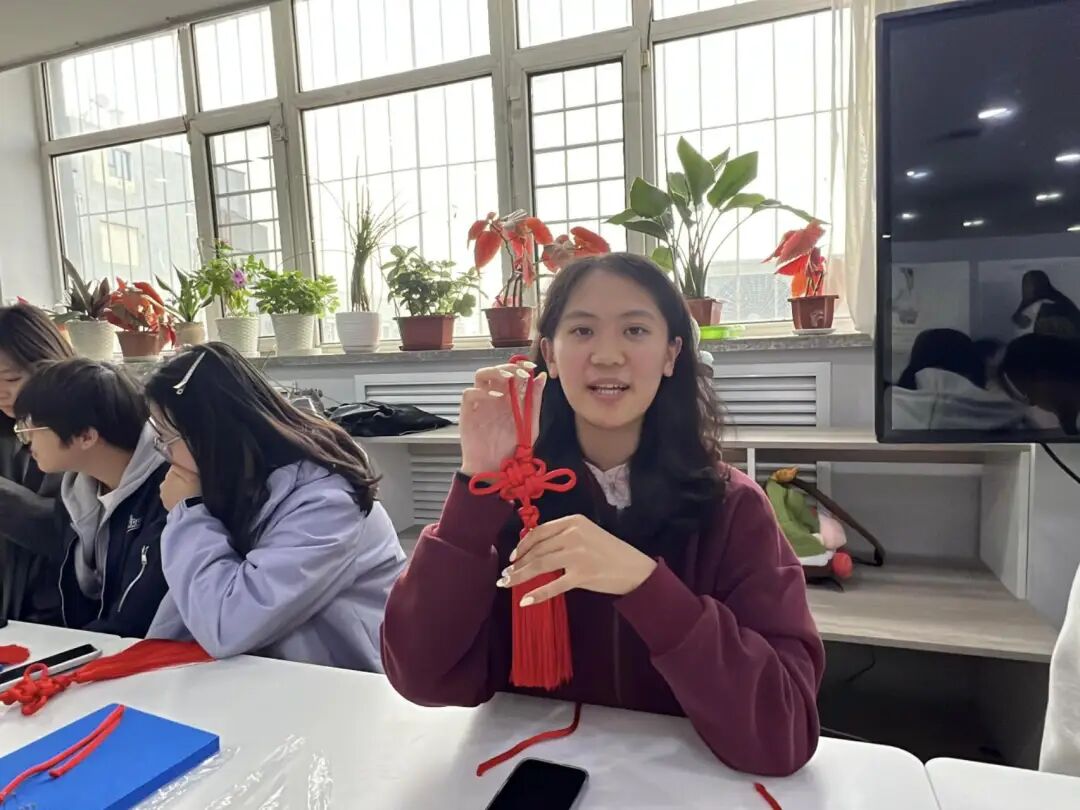 在专业老师的指导下,同学们从最基础的“平结”学起:指尖穿梭于红绳之间,反复摸索绳结的松紧力度与编织逻辑。当一个个完整的中国结在手中成型,同学们切实收获了成功的喜悦。