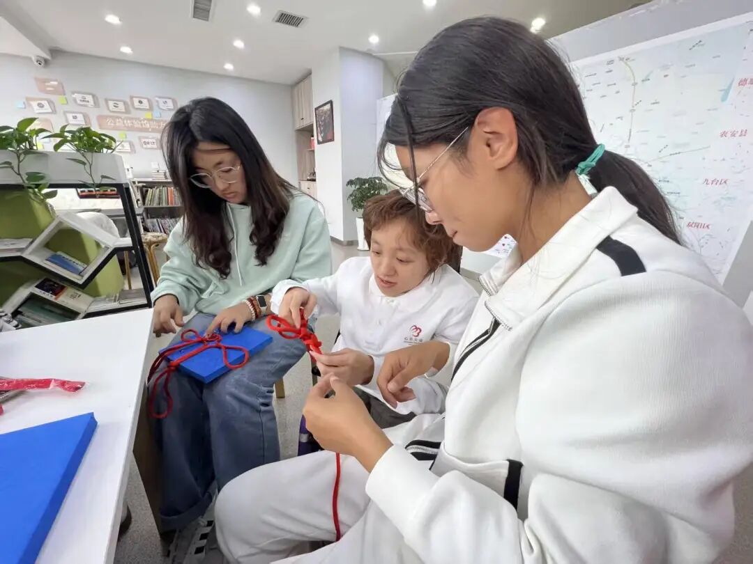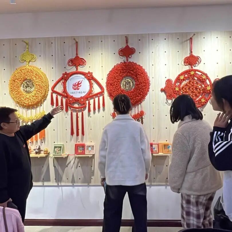 益乐工坊内,陈列着残障手艺人创作的各类中国结作品—从传统“吉祥结”到创新“盘长结”,红绳交错间满是匠心温度。同学们在总会工作人员的带领下参观展品,深刻感受非遗工艺与助残初心的结合,对接下来的中国结编织体验充满热情。