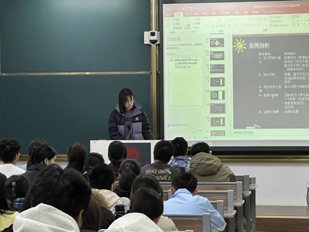 本次分享会由学院团委创新创业中心主任库莹、宋宇萌主讲,她们凭借丰富的创新类比赛实战经验,详细介绍了如何组队、进行项目执行、答辩等多方面问题。接着,她们分享了自身参赛的全流程经历,倾囊传授了实战中的避坑经验与高效方法,让同学们受益匪浅。