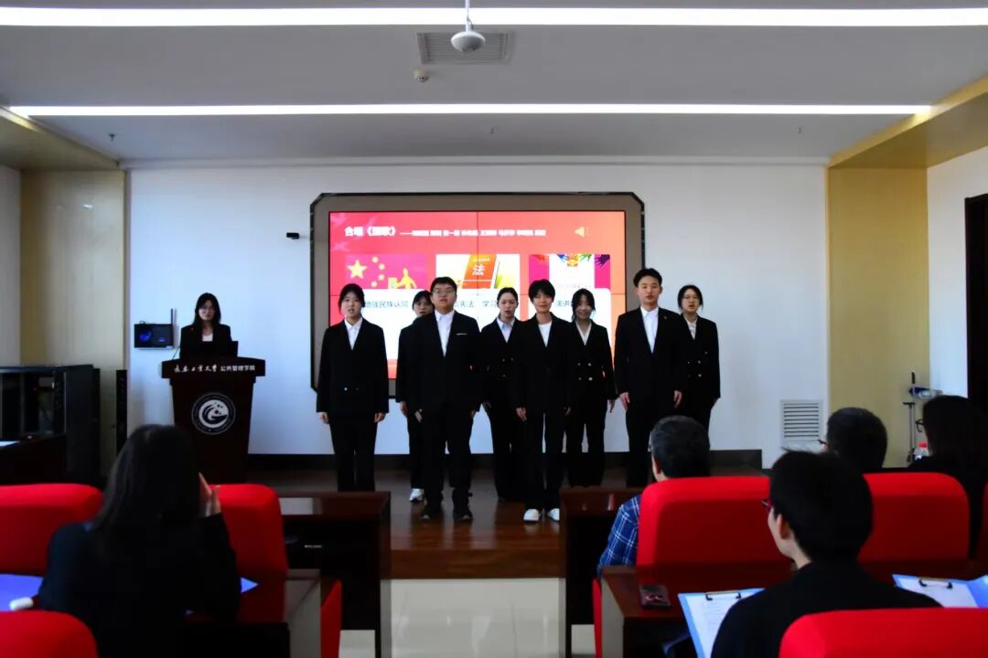 刘晓涵、陈阳、董一蔚、朱希晨、王琳琳、马莎莎、李昀航、屈岩等同学带领全场齐声高唱国歌。在庄严的旋律中,同学们凝聚起强烈的国家认同与集体情感,用歌声表达对祖国的热爱与对宪法精神的尊崇。
