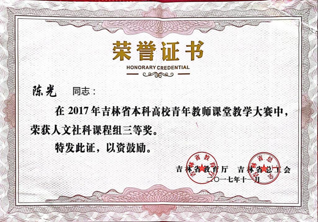 近日,我院教师陈光同志在2017年吉林省本科高校青年教师课堂教学大赛中,荣获人文社科课程组三等奖。
