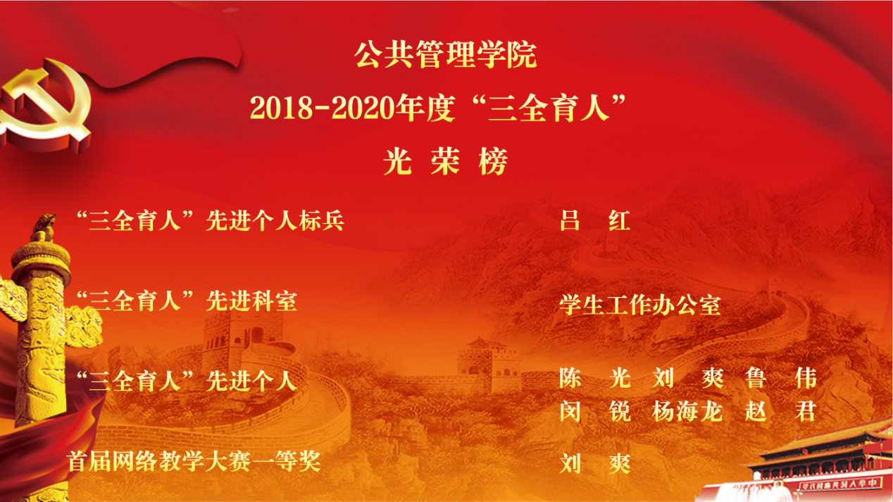 9月10日,学校党委于南湖校区学术报告厅隆重举行2018-2020年度“三全育人”工作表彰大会,我院在此次活动中荣获“先进个人标兵”、“先进科室”、“先进个人”称号及beat365中文官方网站首届网络教学大赛一等奖。