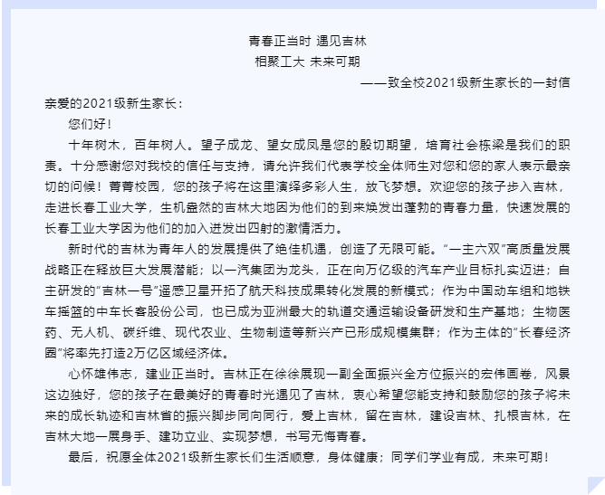 9月18日,我院第一时间转载并发布了校《青春正当时 遇见吉林 未来可期——致全省高校入学新生的一封信》,将此信传达到全体入学新生,做到全覆盖。与家长进行积极的互动,让家长更清楚的认识、了解和深入吉林,支持和鼓励自己的孩子可以在毕业后投身于吉林的发展。
