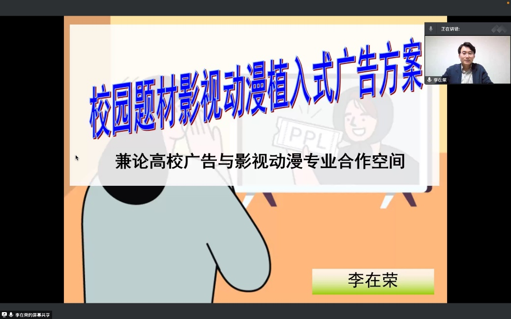 2022年3月22日18:30,广告学系邀请东北师范大学传媒科学学院李在荣副教授,以网络在线的方式作了题为《校园题材影视动漫植入式广告方案探讨》的讲座,广告学师生聆听讲座。