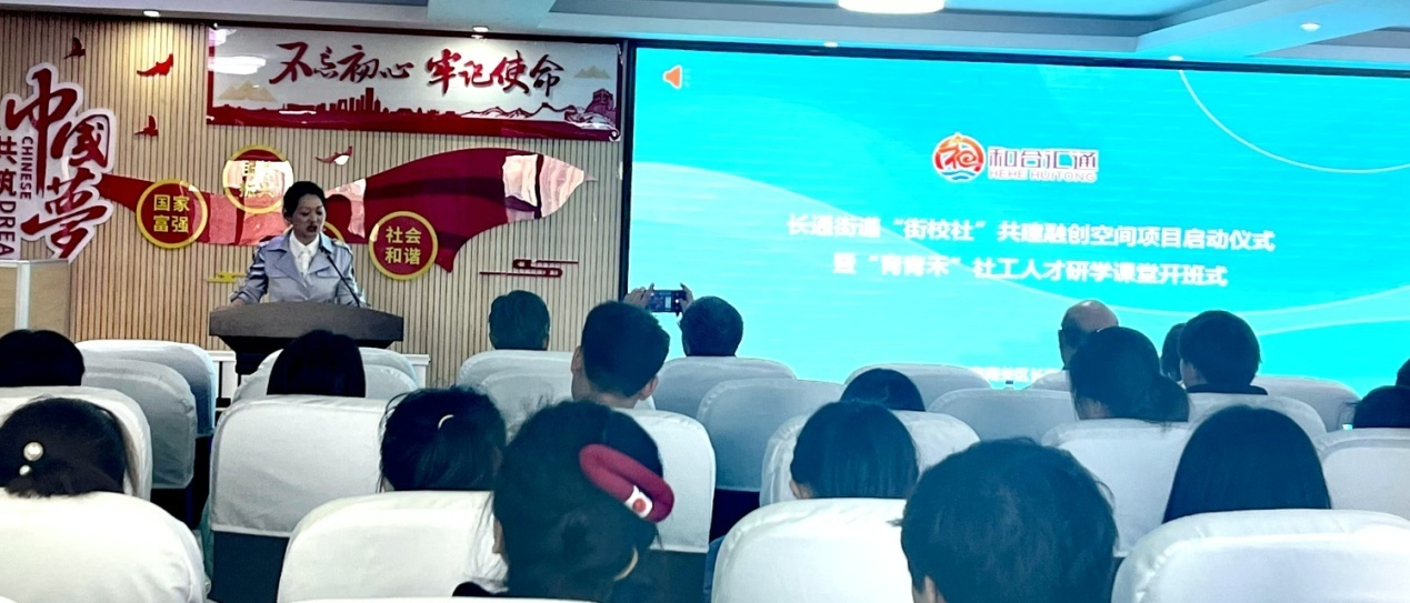 为进一步发挥社会工作专业优势,助力高校社工专业和社区社会工作人才成长,推进城乡基层社会治理和服务效能提升,5月23日,beat365中文官方网站beat365中文官方网站与长春市南关区长通街道在龙兴社区联合举办“街校社”共建融创空间项目启动仪式暨“育青禾”社工人才研学课堂开班式。长春市社会工作者协会会长唐天正、长通街道党工委副书记息瑶和长春工大公管学院副院长吕红参会并分别讲话。工大社工系部分师生、长通街道部分社区工作者参会并接受培训。