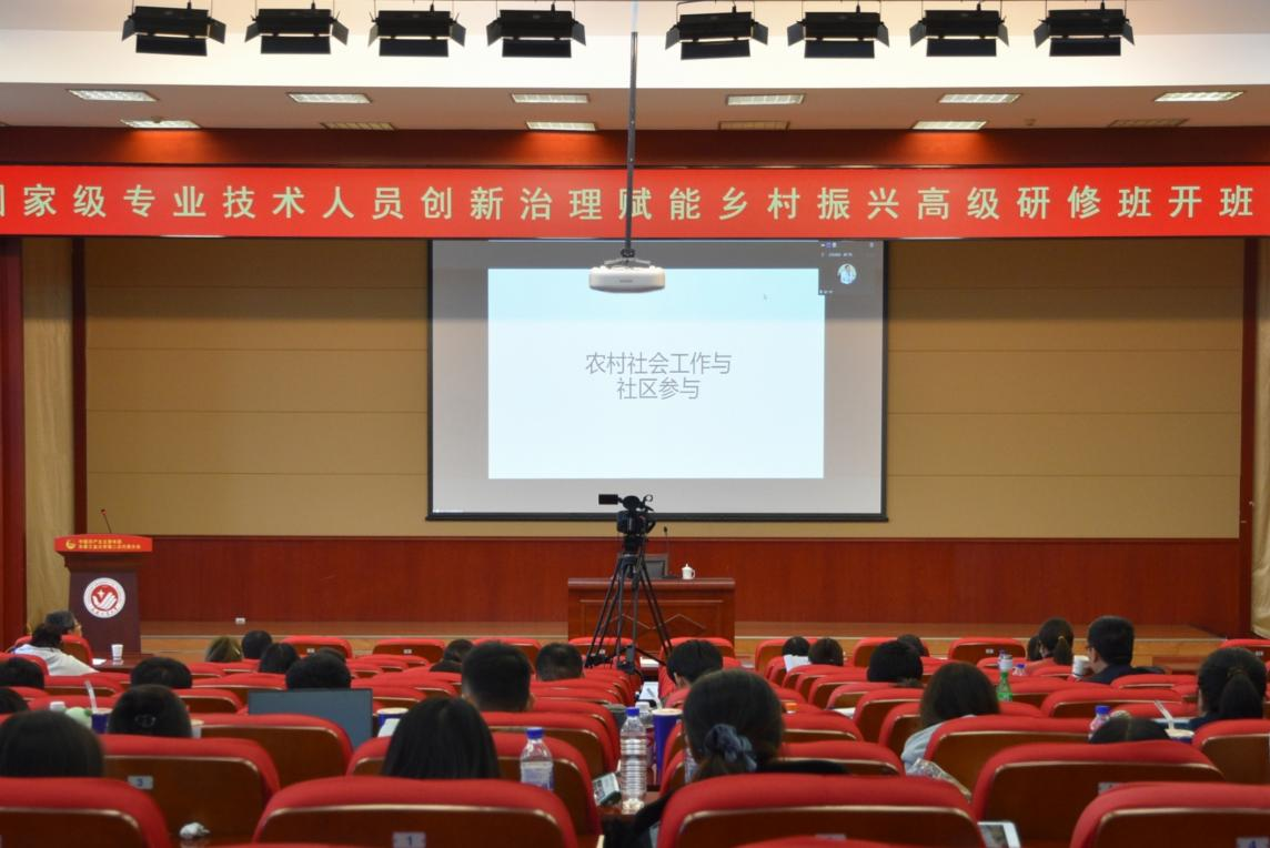 本网讯(通讯员 汤道化)10月17日下午,国家级专业技术人员“创新治理赋能乡村振兴”高级研修班活动在我校南湖校区学术报告厅继续进行。第六场主讲嘉宾特邀南开大学郑广怀教授,他为学员们作了题为“农村社会工作与社区参与”的线上讲座。beat365中文官方网站副院长汤道化主持讲座。学院党委书记于洪、院长韩小威教授、副院长冯娜副教授及百余名师生、学员参加讲座。