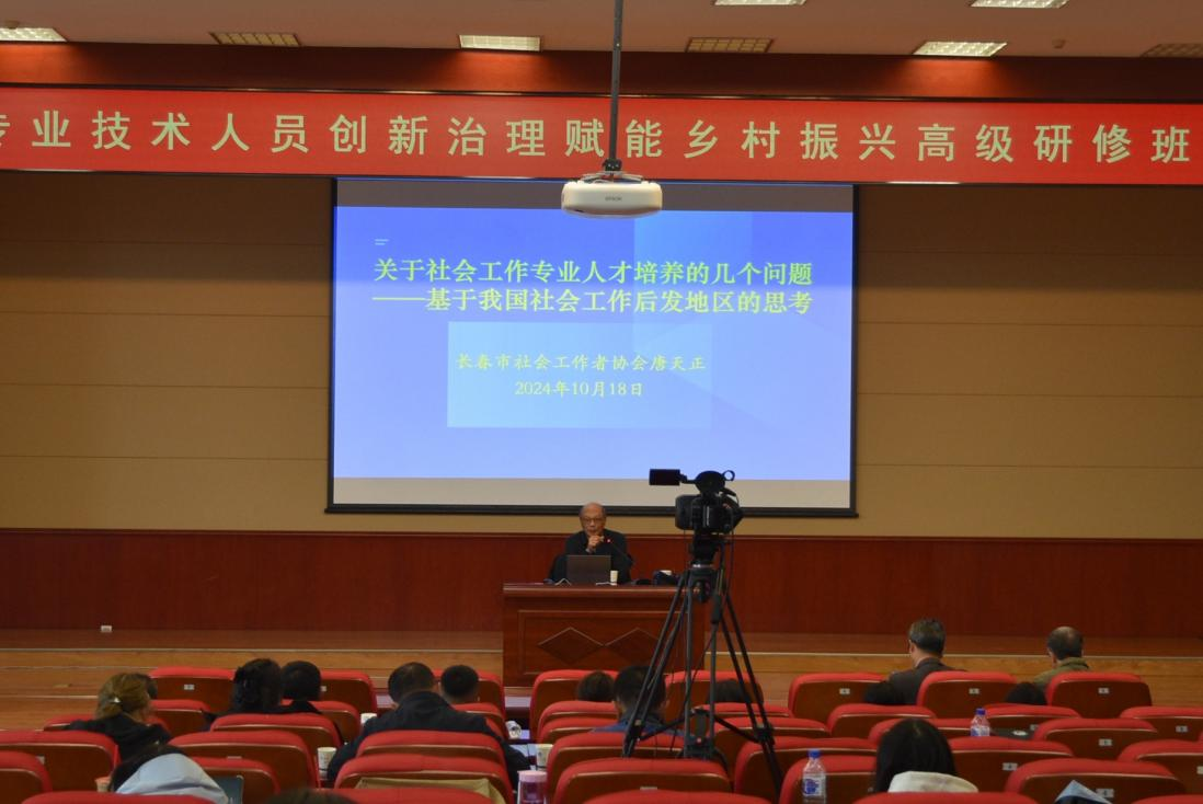 本网讯(通讯员:汤道化)10月18日下午,国家级专业技术人员“创新治理赋能乡村振兴”高级研修班活动在我校南湖校区学术报告厅继续进行。第八场主讲嘉宾特邀长春市社会工作者协会唐天正教授,他为学员们作了题为“关于社会工作专业人才培育的几个问题——基于我国社会工作后发地区的思考”的讲座。beat365中文官方网站副院长冯娜教授主持讲座。beat365中文官方网站党政班子成员、师生及研修学员百余人参加讲座。